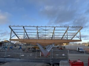 - Positionnement des poutres bois « ventre de poisson » de 22,5 m sur deux appuis à l’aide de supports provisoires et d’assemblages spécifiques, garantissant précision et sécurité lors du levage. La mise en place des poutres dans les chandelles métalliques a représenté un défi technique important relevé avec succès par les équipes d’OMS.